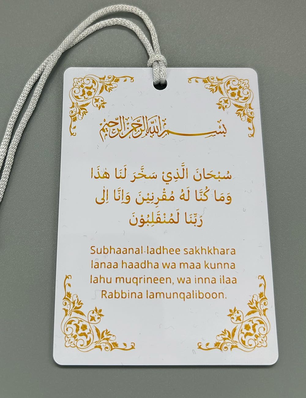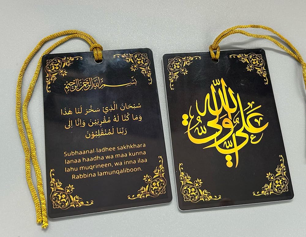Bring a touch of spirituality to your vehicle with this Islamic car hanging featuring the powerful phrases ‘Ali Waali Allah’ and ‘Safar Dua’. Crafted as a rear-view mirror pendant, this Shia Imam accessory serves as a constant reminder of faith and protection during your journeys. Its elegant design complements any car interior, allowing you to express your beliefs while on the road. Measuring X cm in length, this pendant hangs gracefully, catching the eye without obstructing your view. Whether embarking on a long-distance trip or running daily errands, this Islamic car hanging provides a sense of serenity and divine guidance throughout your travels.