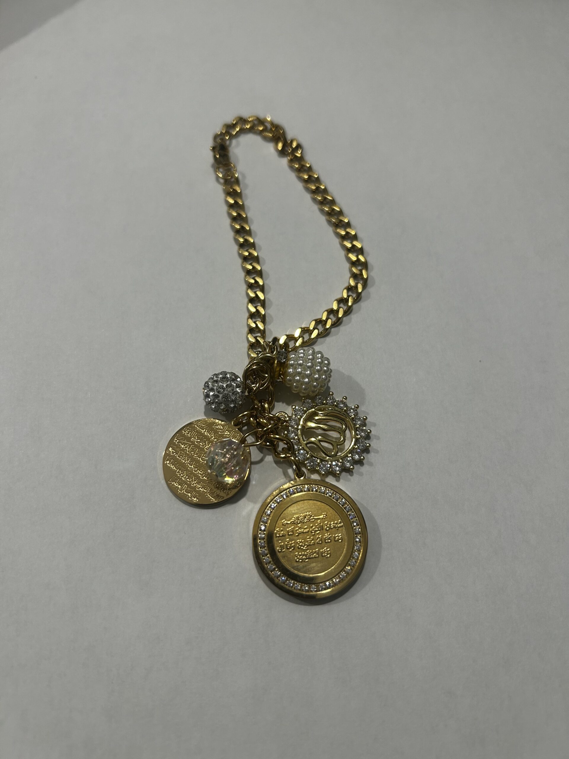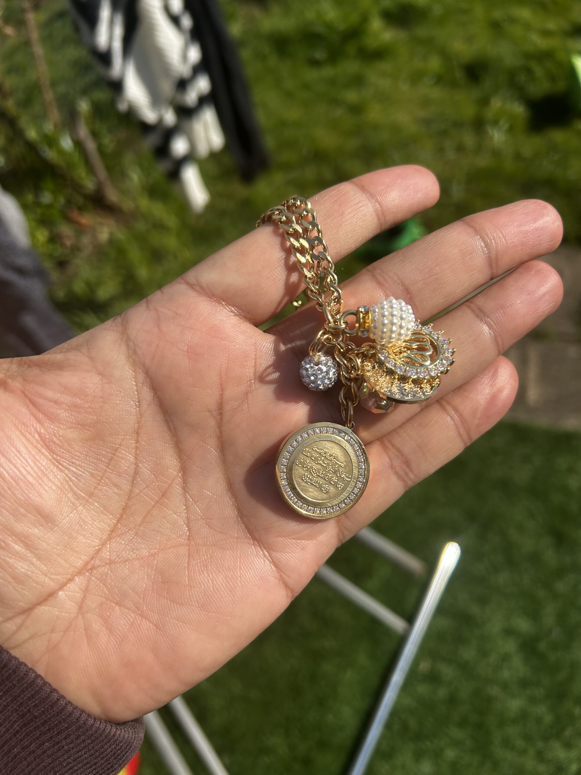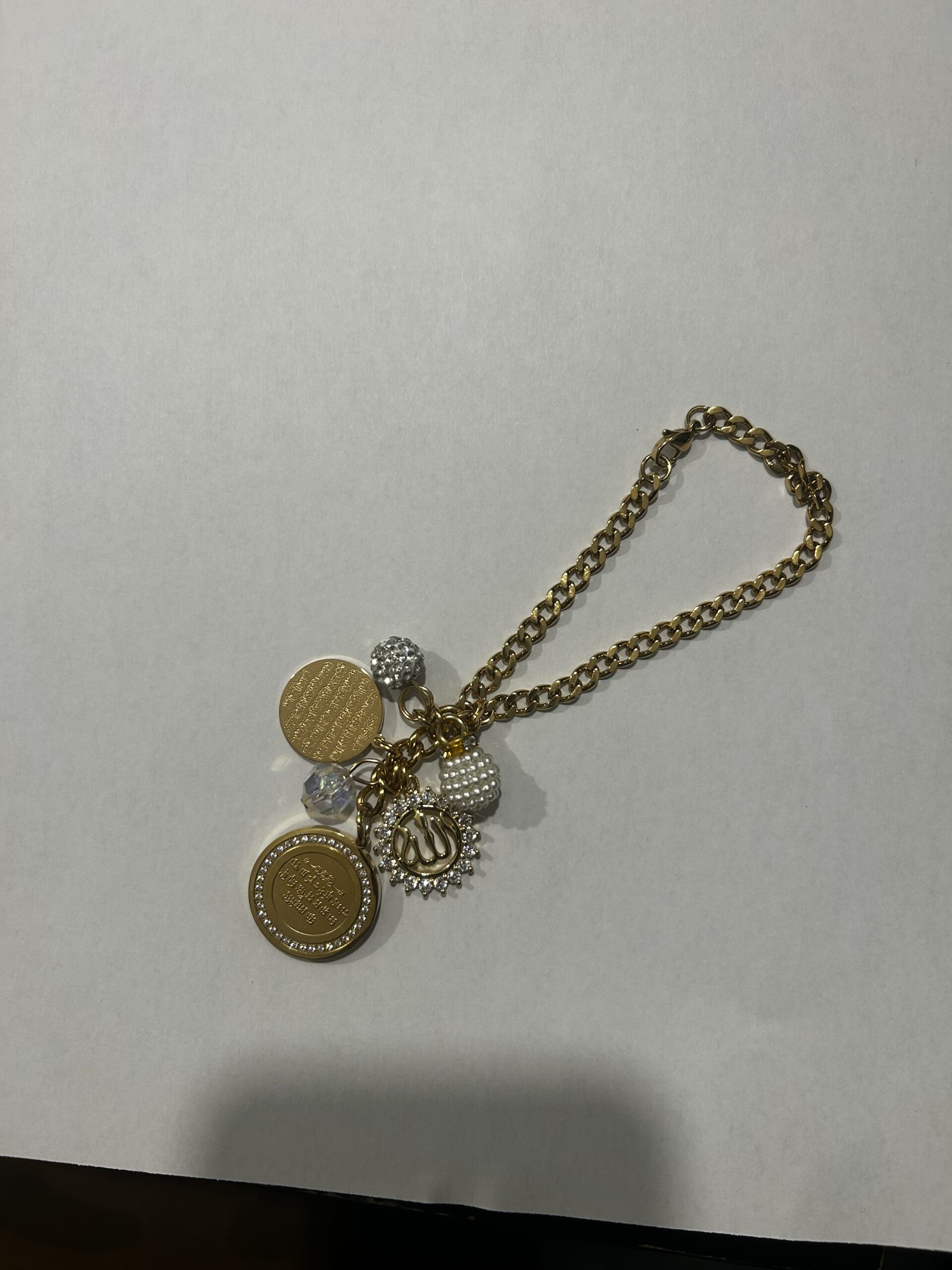 Carry your faith with elegance using this Islamic Keychain Charm, a beautifully crafted accessory that combines style and spirituality. Made with premium gold-toned metal, it features a round Allah pendant, an Ayatul Kursi charm, and sparkling crystal and pearl beads, symbolizing light, guidance, and divine protection.