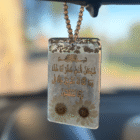 Bring faith and serenity to your daily drives with this Islamic Car Hanging Decoration, beautifully designed with gold Arabic calligraphy featuring Ayatul Kursi on one side and the Dua for Travel (Subhanalladhi Sakhkhara Lana…) on the other. Handcrafted from premium-quality resin, this elegant ornament combines faith and artistry, showcasing real dried flowers and shimmering gold flakes encased in a glossy, durable finish.