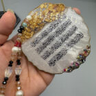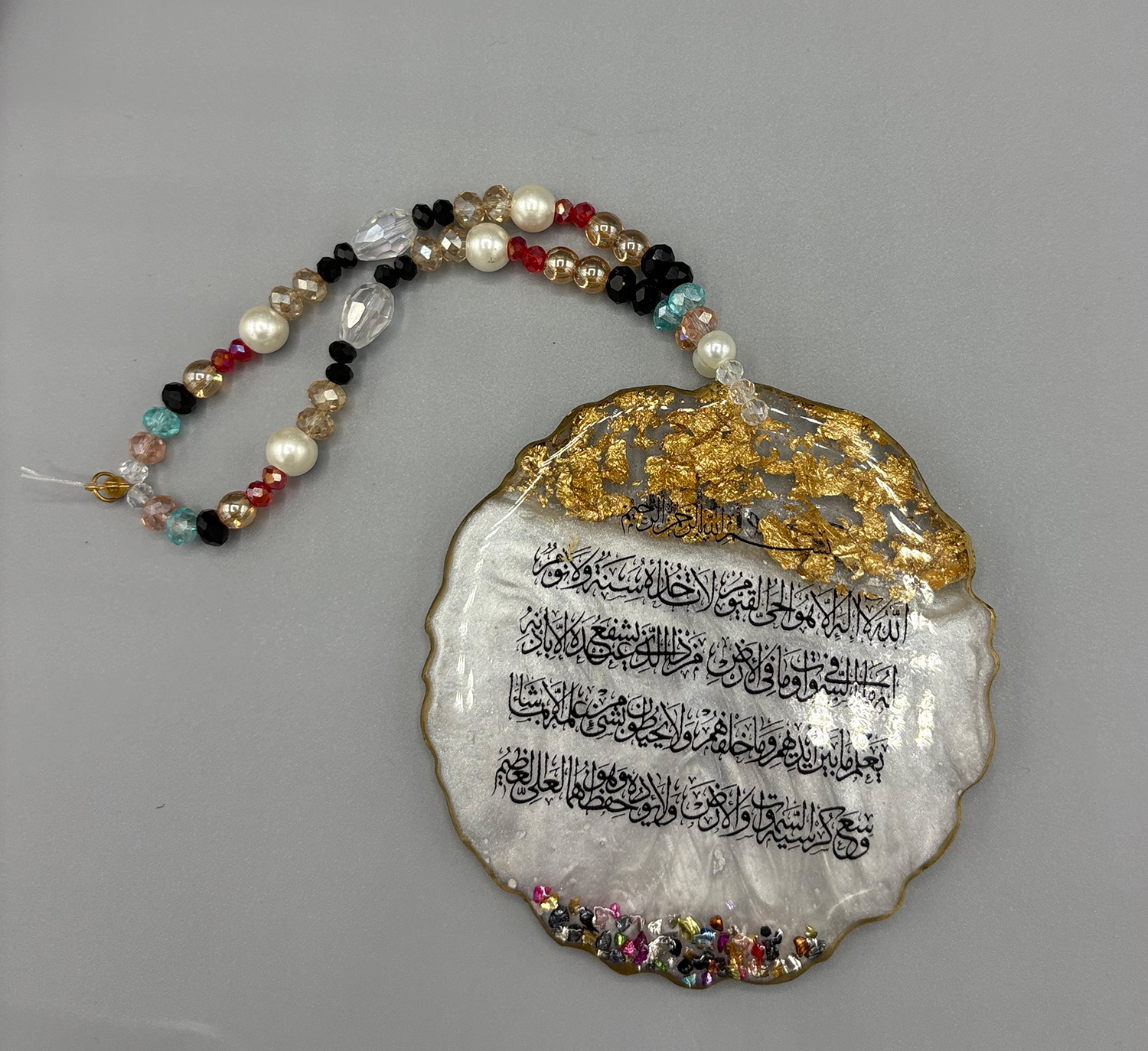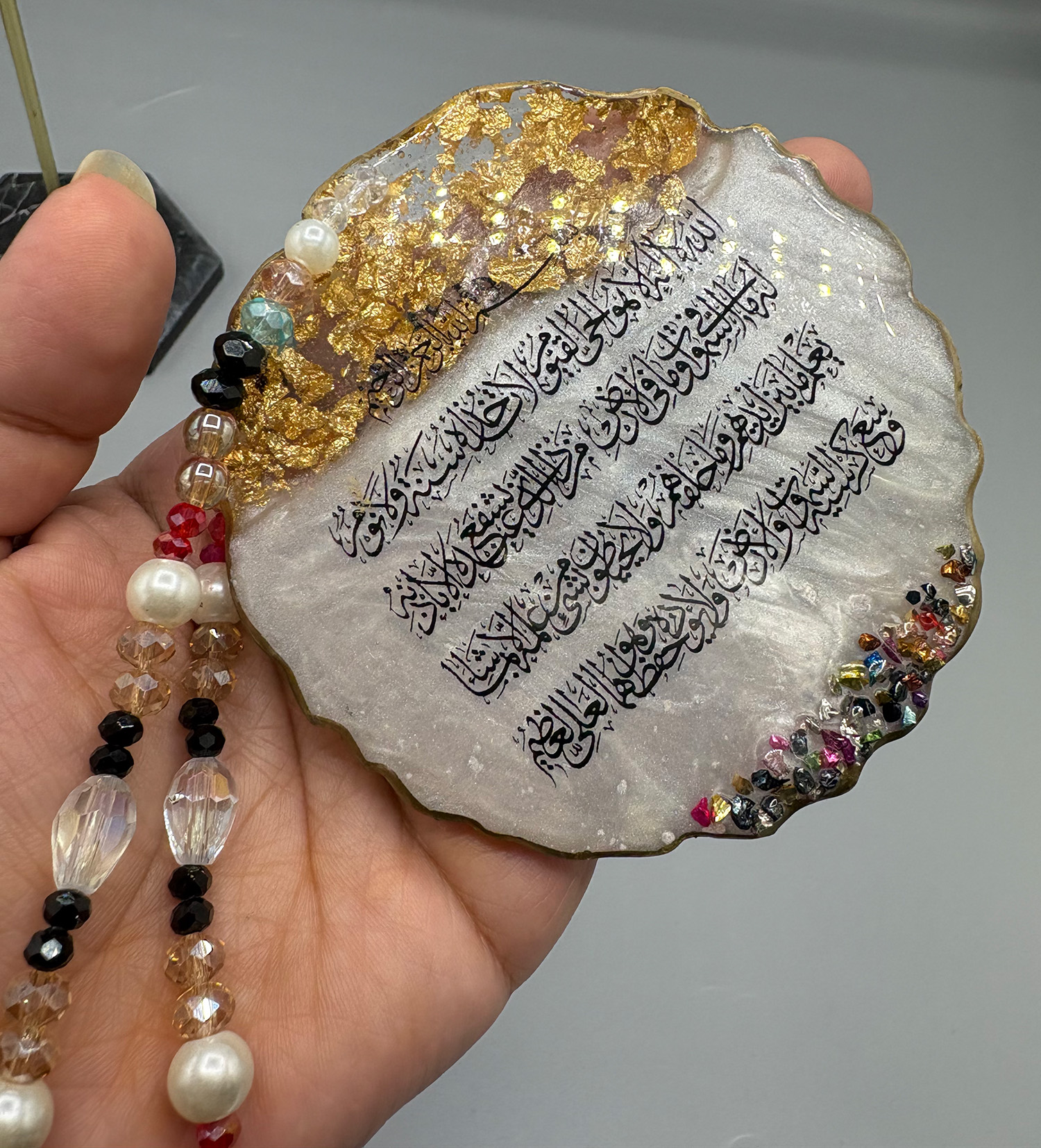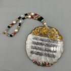 Each piece is carefully crafted with gold calligraphy, embedded metallic flakes, and a luxurious glossy finish, resulting in a stunning and durable appearance. The handcrafted beaded chain complements the design, featuring glass-like beads and pearls that reflect light beautifully.