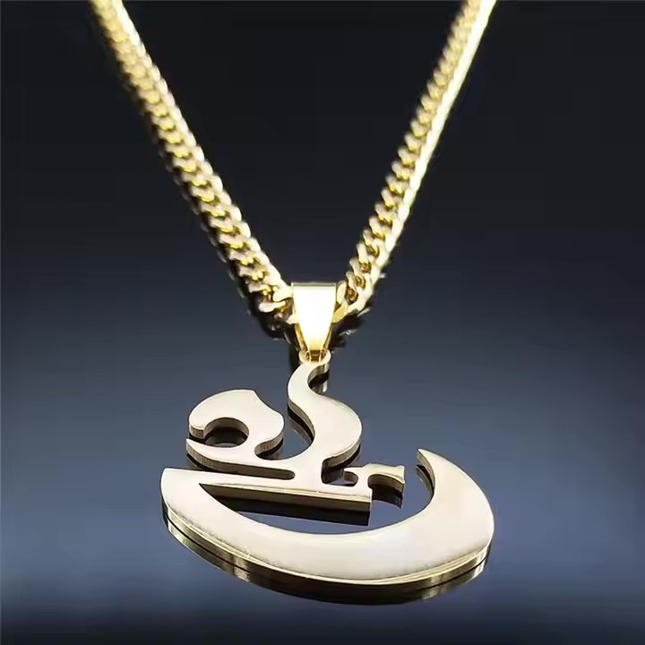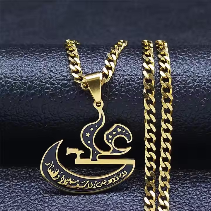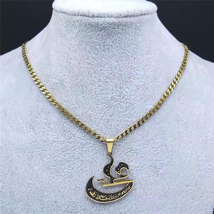 This beautiful Arabic calligraphy “Ali” pendant necklace and Car Hanging is a timeless piece of Islamic jewellery, designed to reflect faith, strength, and elegance. Crafted from premium stainless steel with a radiant gold finish, this piece features an intricately detailed pendant inscribed with the name “Ali” in elegant Arabic calligraphy, complemented by subtle black enamel accents for added depth. The chain’s polished links offer a smooth, modern look while ensuring long-lasting durability and comfort against the skin.