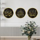 Enhance your home with this Islamic Wall Art Set of 3, featuring beautifully designed circular pieces of Allah, Muhammad (ﷺ), and Ayatul Kursi in elegant Arabic calligraphy. Crafted with intricate gold detailing on a sophisticated black marble background, this set brings a touch of luxury, spirituality, and balance to any interior.