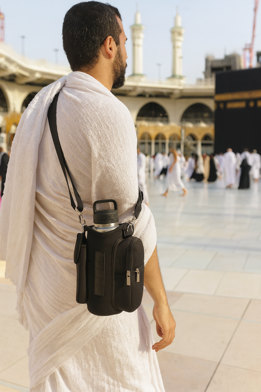 This Bottle Carrying Bag is designed to make your Umrah and Hajj journey easier, lighter, and more organised. With a built-in magnetic sleeve, it securely holds your water bottle in place—perfect for long walks during Tawaf, Sa’i, or daily travel between your hotel and the Masjid.